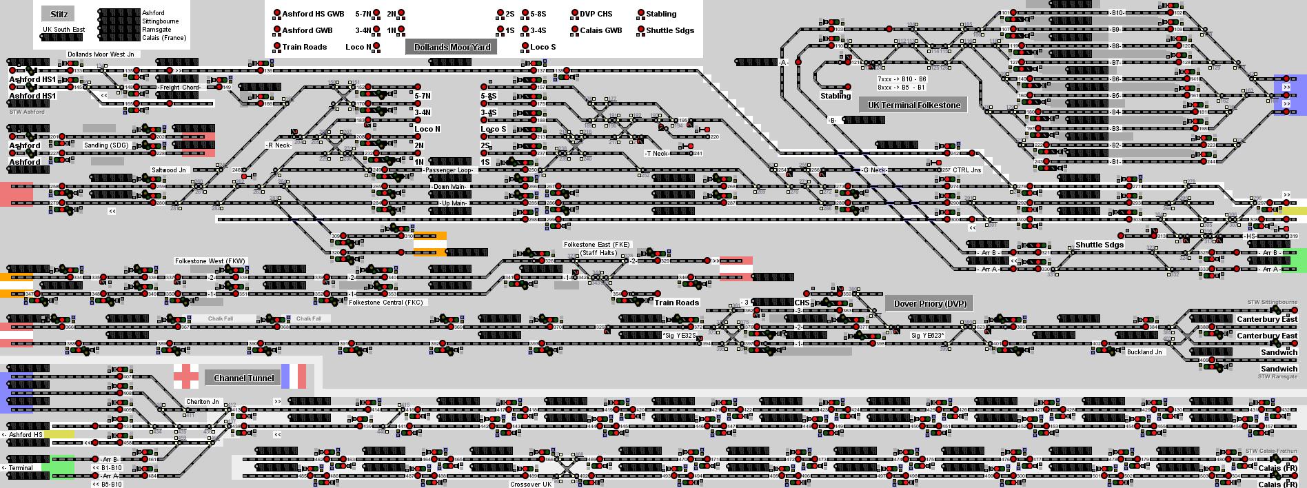 ----- English version ----- Welcome to Dartford! The town of Dartford has around 51,000 inhabitants (as of 2023). It lies on the eastern edge of Greater London. All passenger trains in this signal box are operated by Southeastern, Thameslink and Chiltern Railways . Some goods trains come here too. Erith loop and Crayford spur are curves that make it possible to run trains in circles to and from London Charing Cross or Cannon Street. However, these had to be partially interrupted due to technical limitations of Stellwerksim. The abbreviations BEX and BTC stand for ‘Engineer's Line References’, i.e. the route designations. BEX stands for ‘St. Johns Junction - Crayford Creek Junction via Bexleyheath’ and BTC for ‘Blackheath Junction - Charlton Junction’. In Dartford you are responsible for 4 lines: Greenwich line (Charlton - London Bridge) North Kent Line (Greenhithe - Dartford - Lewisham via Abbey Wood) Bexleyheath line (Dartford - Lewisham via Bexleyheath) Dartford Loop Line (Dartford - Hither Green) Sidings etc: