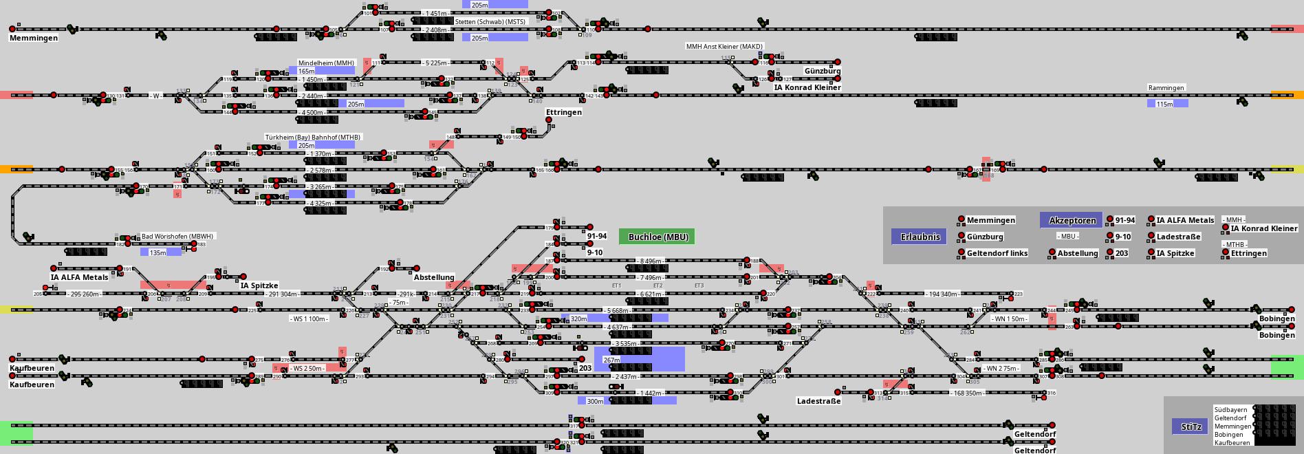 Hier findet man einen wichtigen Bahnhof Merxferris und 2 Eisenbahnkreuze, die den Verkehr gen Norden tragen. Vom Hauptbahnhof kommen 2 Strecken, welche sich in Brillerbeck teilen. Die "gelbe" Strecke führt weiter ins Kreuz Faister Heide, wo wiederum in Richtung Lossal und auf den Ring gefahren werden kann. Die "orangene" Strecke führt nach Schwabenhausen, wo sich die Strecke wiederum teilt. Die "orangene" Strecke führt nach Hellerbiek bzw. zum Rangierbahnhof Rintal und zum Ostkreuz. Die "weiße" Strecke führt nach Lossetal und weiter nach Drebendorf und Bültum. Die andere Richtung führt zum Hauptbahnhof, wo sich die Strecken dann gen Süden und Westen verteilen. In Billerbeck zweigt außerdem die Strecke nach Dattenheim ab. Diese umfährt dabei den Hauptbahnhof. Zwischen Schwabenhausen und Dietrichsdorf gibt es Verbindungskurven, damit die Züge vom Rangierbahnhof weiter zum Kreuz Faister Heide fahren können. Des Weiteren beinhaltet das Stellwerk eigene S-Bahn Trassen, welche sich, wie die anderen Strecken, in Brillerbeck bzw. in Schwabenhausen aufteilen. Zwischen dem Abzweig Dietrichsdorf und Arminstraße (Stw. Faister Heide) teilen sich alle Zuggattungen 3 Gleise, wobei die S-Bahnen nur die zwei äußeren Gleise benutzen können, da das Mittelgleis keinen Bahnsteig besitzt. In Schwabenhausen gibt es ein Autowerk der MMV. Außerdem kann es hilfreich sein, Güterzüge in Schwabenhausen auf die Seite zu nehmen und je nach Betriebssituation weiterfahren zu lassen. Im gesamten Stellwerk ist dispositives Geschick gefordert, da zum Teil viele Züge unterwegs sind. Es verkehren alle Zuggattungen. Laufwege der S-Bahn: S3: Drebendorf-Mitternitz-Lossetal-Brillerbeck-Merxferri Hbf-Brembacher Damm-Christinenhof-Plassdorf-Mühlberg S7: Plassdorf-Kremmerberg-Brembecher Damm-Merxferri Hbf-Brillerbeck-Faister Heide-Rothenwesten-Meddelbach S15: Brillerbeck-Dattenheim/Westkreuz-Waltersberg-Kreuzenbeck S33: Brillerbeck-Lossetal-Mitternitz-Drebendorf S35: Wilmersdamm-Lossetal-Brillerbeck-Hbf-Brembacher Damm-Christinenhof S75: Central Station-Merxferri Hbf-Brillerbeck-Faister Heide-Rothenwesten-Mitternitz Weitere Informationen zu Zugläufen und Strecken findest du unter www.merxferri.de Das Stellwerk ist für vorgeschrittene Spieler geeignet, es gibt aber auch ruhigere Phasen. Eventuell soll das Stellwerk auch im Offline-Modus getestet werden. Die Erbauergemeinschaft von Merxferri wünscht dir viel Spass. Merxferri (W)