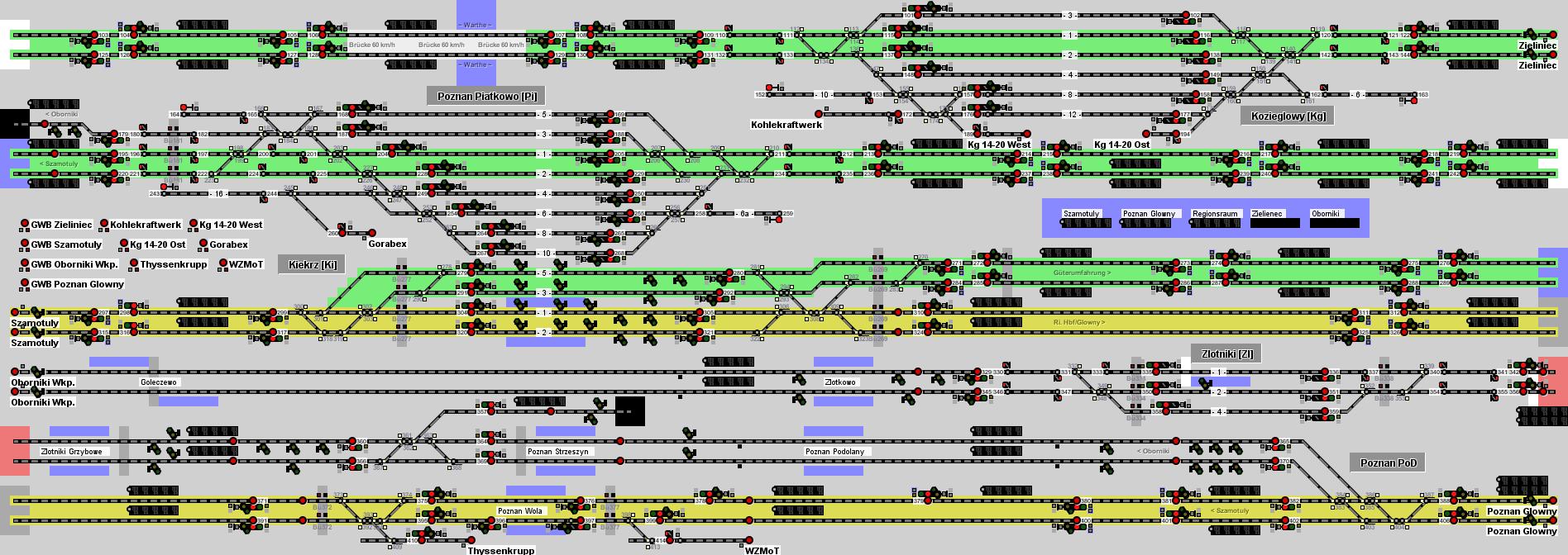 Hier steuert ihr den Zulauf zum Hauptbahnhof (pl. Glowny) der fünftgrößten Stadt des Lands auf zwei verschiedenen Strecken. Zum einen sind das etwa 10 km der Hauptstrecke Poznan-Szczecin. Sie ist eine vollständig zweigleisige und elektrifizierte Magistrale. Diese wurde in den vergangenen Jahren erneuert und ausgebaut und ist damit im dargestellten Abschnitt weitestgehend für 160 km/h ertüchtigt worden. Es gibt einen Haltepunkt im Stadtgebiet von Poznan und Kiekrz weiter außerhalb. Zum anderen sind das etwa genauso viele Kilometer der Strecke Poznan-Pila. Diese ist hier noch zweigleisig, im weiteren Verlauf wird sie aber auch eingleisig. Es sind hier 120 km/h erlaubt. An dieser Strecke gibt es eine ganze Reihe an Haltepunkten, jedoch nur einen Bahnhof mit einem Überholgleis. Beide Strecke treffen sich wenige Kilometer vom Hauptbahnhof entfernt am Abzweig Poznan PoD, von wo an es dann zweigleisig weitergeht, so dass sich hier die Züge auch mal stauen können. Zur Umfahrung des Hauptbahnhofes zweigt von der Stettiner Strecke in Kiekrz die Güterumgehungsbahn ab. Diese führt von dort durch den Norden der Großstadt und erreicht dann im Osten weitere Strecken und den Hauptgüterbahnhof der Stadt. Die Strecke ist vollständig zweigleisig und elektrifiziert. Nahe des Bahnhof Piatkowo gibt es auch eine eingleisige Verbindungskurve für die Züge von/nach Pila. Auf der Güterumgehungsbahn sind 80 km/h erlaubt, auf der Brücke über die Warthe 60 km/h. An ihr liegen auch noch einige Anschlüsse zu Unternehmen wie einem großen Kohlekraftwerk. Die Strecke ist bislang dem Güterverkehr vorbehalten, soll jedoch in den kommenden Jahren mit Bahnsteigen ausgestattet werden und dann vom Hauptbahnhof aus kommend über eine neue Verbindungskurve nahe Poznan Streszyn mit Personenzügen befahren werden. Diese könnten dann als Ringlinie einmal durch den Norden und Osten der Stadt verkehren und dabei die Güterumgehung und den Bereich des Güterbahnhofs im Osten an den Personenverkehr anbinden. Der Zugverkehr ist geprägt von der PKM, einem S-Bahn-ähnlichen Vorortverkehr von Posen aus. Es verkehren auf beiden Strecken Züge dieses Systems meist bis Szamotuly bzw. Oborniki. Dazu kommen einige Regionalzüge, die meist von Poznan bis nach Szczecin oder sogar Swinoujscie an der polnischen Ostsee fahren und auf der anderen Strecke von Poznan bis nach Kolobrzeg ebenfalls an die Ostsee. Zum Regionalverkehr kommt auch noch der Fernverkehr etwa alle zwei Stunden mit Zügen Richtung Szczecin und genauso oft Richtung Pila/Ustka. Hinweise: