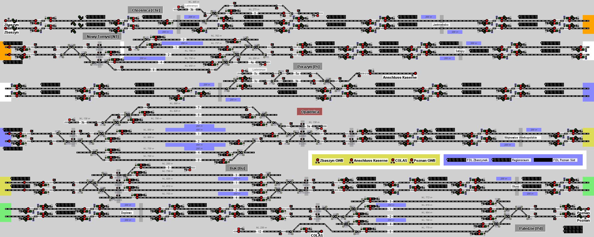 Ihr seid verantwortlich für die Strecke von Köndringen bis Offenburg. Der Bahnhof Offenburg umfasst zwei Bahnhofsteile: zum einen den Personenbahnhof, welcher hier komplett abgebildet ist und den Güterbahnhof, der hier nur angedeutet wird. In Offenburg enden die RE/RB der Linie Offenburg - Freiburg - Basel sowie OSB/SNCF-Züge aus Kehl und Hausach. In Offenburg treffen sich die Rheintalbahn und die Schwarzwaldbahn, ab hier geht es viergleisig weiter bis Rastatt-Süd. Ab Offenburg wird unterschieden zwischen Fernbahn (hellgrau) und Rheintalbahn (grün). Ihr könnt z.B. bei Bauarbeiten oder dichter Zugfolge auch Züge über die Fernbahn bzw. Rheintalbahn umleiten. Dabei ist die Absprache mit dem Fahrdienstleiter in Baden-Baden wichtig, da nicht jeder Zug umgeleitet werden kann. Direkte Übergabe ist nach Freiburg und Hausach sowie Baden-Baden möglich. Einige Güterzüge haben einen Durchfahrpunkt "Pbf" im Fahrplan, dieser ermöglicht es flexibel ein Gleis im Bereich des Personenbahnhofs nutzen zu können. Einige Bahnhöfe haben Kennzahlen, diese sind sowohl bei den dazugehörigen Signalen als auch Gleisen wiederzufinden. LZB-Blöcke haben ein L, die Blocksignale ein B vor der Bezeichnung. LZB-Blöcke im Bahnhof sind teilweise mit Deckungssignalen nachgebildet. Viel Spaß beim Spielen wünscht das ganze Erbauer Team BaWü. |