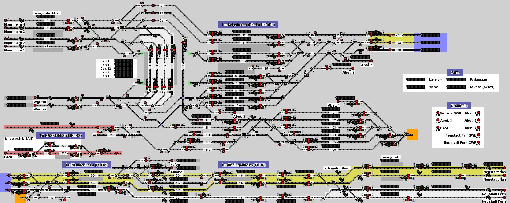Ihr steuert hier den Bereich rund um den Hauptbahnhof Ludwigshafen mit den Bahnhofsteilen LU-Mundenheim, LU-Rheingönheim sowie den Haltepunkten LU Mitte und Limburgerhof. Der Hauptbahnhof wurde in den 1970er Jahren als großzügiger Dreiecksbahnhof konzipiert, um den Verkehr in alle Richtungen effizient aufnehmen zu können. Da jedoch Mannheim als Systemknoten im Nah- und Fernverkehr bestimmt wurde und der Bahnhof außerhalb des Stadtzentrums liegt, blieb das erwartete Fahrgastaufkommen aus. Heute ist der Bahnhof für seine tatsächliche Funktion als regionaler Knotenpunkt überdimensioniert. Der Großteil der Personenzüge sowie ein erheblicher Teil des Güterverkehrs wird über den Rhein nach Mannheim geführt. Der zentral gelegene Haltepunkt Ludwigshafen Mitte übernimmt inzwischen den Großteil der Fahrgastströme. Unmittelbar angrenzend befindet sich das Werksgelände der BASF, eines der größten Chemieunternehmen der Welt. Seit Dezember 2018 verkehrt die S-Bahn regelmäßig zwischen dem Werk und dem Hauptbahnhof. Dafür wurde die Strecke Richtung LU BASF Süd samt Teilen des Werksgeländes elektrifiziert. Der Güterverkehr wird hingegen vorrangig über LU-Oggersheim (Stellwerk Worms) abgewickelt. Hinweise und Infos: