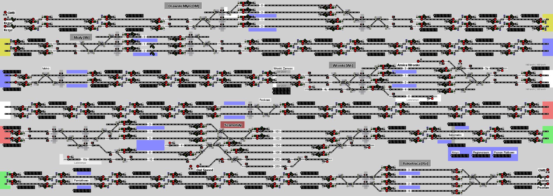 einer Stadt mit knapp 67.000 Einwohnern (Stand 2022) in der Region rund um die Großstadt Szczecin (dt. Stettin) in der Woiwodschaft Westpommern. Ihr steuert hier die Strecke Szczecin - Poznan mit direkter Übergabe an den Hauptbahnhof in Szczecin und von dort weiter bis hinter Stargard. Nach der Einfädelung von den beiden Strecken aus dem Stadtzentrum geht es auf 3 Gleisen weiter nach Osten. In Szczecin Dabie zweigt hier die zweigleisige Strecke nach Swinoujscie (dt. Swinemünde) nach Norden ab. Es gibt hier auch eine Verbindungskurve für Züge aus Richtung Süden direkt in diese Richtung mit Umfahrung des Personenbahnhofs. Ab Szczein Dabie ist die Strecke zweigleisig mit zahlreichen Blocksignalen und verfügt nur über einen weiteren Überholbahnhof vor Stargard. Dort gibt es umfangreiche Gleisanlagen und Anschlüsse zu steuern. Die Strecke verzweigt sich hier in südöstliche Richtung nach Poznan (Ausfahrt Kolin) und in östliche Richtung nach Ulikowo, wo es in die Richtungen Pila, Szeczinek und in die Dreistadt Gdańsk (Danzig), Gdynia (Gdingen) und Sopot (Zoppot) geht. Die Strecke nach Stargard wurde und wird nach dem Jahr 2020 umfangreich modernisiert und u.a. für ein S-Bahn-ähnliches System rund um Szczecin vorbereitet. Zudem ist der Umbau zahlreicher Gleisanlagen und Bahnhöfe im Gange. Daher kommt es hier auch beim abgebildeten Fahrplan 2020 zu größeren Einschränkungen im Bahnhof Stargard. Es stehen nur die Gleise 7 und 9 für den Personenverkehr zur Verfügung, daher kann es hier vielleicht zu Stoßzeiten und Verspätungen zu Schwierigkeiten kommen. Hinweise: