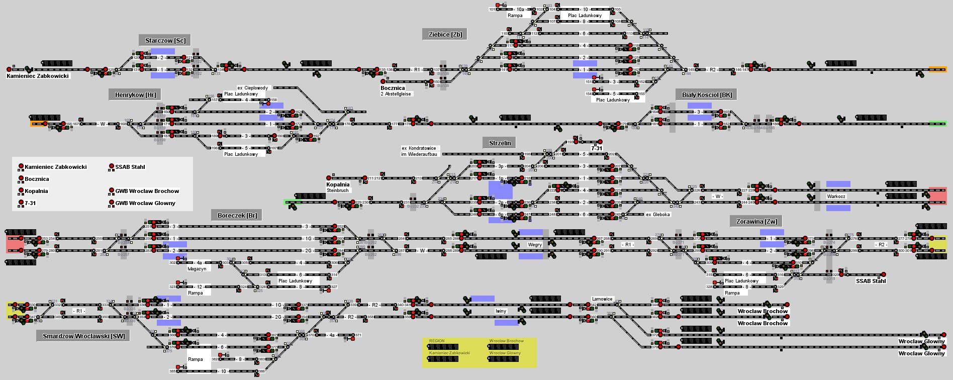 Strzegom (deutsch Striegau) ist eine Stadt und Sitz der gleichnamigen Stadt-und-Land-Gemeinde im Powiat Swidnicki in der Woiwodschaft Niederschlesien in Polen. Die Stadt liegt am Striegauer Wasser (Strzegomka), etwa 15 Kilometer nordwestlich von Swidnica (Schweidnitz) und 52 Kilometer westsüdwestlich von Breslau (Wroclaw). Der Bahnhof Strzegom liegt an der Bahnstrecke 137 Katowice – Legnica, von der kreuzenden Bahnstrecke Malczyce–Marciszow ist nur noch ein kurzer Anschluss zu einem westlich gelegenen Bergwerk in Betrieb. Noch ein paar Sätze zu den zahlreichen Anschlüssen: In Nowa Wies Legnicka (der zugehörige Haltepunkt wurde aufgelöst) findet ihr einen Metallhändler (Centrozlom). Südlich von Przybylowice die KSS Bartnica (Basaltverladung für den Straßenbau). Weiter auf der Strecke, in Stary Jawor befindet sich das neue Mercedes Benz-Werk Poland sowie ein Zementwerk von Lafarge. In Jawor geht es zu einer Schüttgutverladung sowie zur alten Strecke nach Dzierzkow (ehemals bis Marciszow). Auf dieser Strecke findet sich noch ein Steinbruch (Granit) sowie eine Schüttgutverladung. In Rogoznica ist eine Holzverladung, ein Colas Steinbruch (Granit), die Kopalnia (Steinbruch) "Graniczna", sowie ein sehr großes Areal von Track Tec S.A. und DOLKOM. Track Tec S.A. stellt u.a. Betonschwellen für die Eisenbahn her, DOLKOM ist ein Infrastrukturunternehmen für den Gleisbau. In Strzegom selbst gibt es nebst o.a. Bergwerk für Granit noch zwei Schüttgutgleise und eine Kopframpe. Der von euch zu steuernde Abschnitt der Strecke 137 zwischen Legnica und Jaworzyna Slaska ist in keinem besonders guten Zustand und darf daher nur mit 60 km/h befahren werden (lediglich zwischen Rogoznica und Strzegom sind 80 km/h erlaubt). Zwischen Legnica und Nowa Wies Legnicka sogar nur eine Höchstgeschwindigkeit von 50 km/h. Durch die zahlreichen noch aktiven Anschlüsse wurde die gesamte Strecke 137 zwischen Legnica und Katowice von der PKP als "Güterverkehrsvorrangstrecke" eingestuft. Bis auf den Abschnitt ca. Höhe Nowa Wies Legnicka - Legnica ist im gesamten Stellwerk keine Oberleitung zu finden. Viel Spaß wünscht das Team Polen. Zuggattungen in Polen Polen (W)
