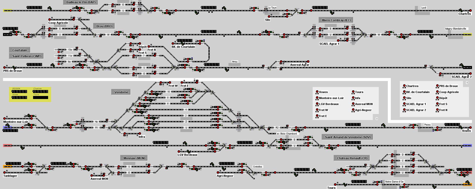 Vaires-sur-Marne ist eine französische Gemeinde im Département Seine-et-Marne in der Region Île-de-France. Sie liegt im Osten des Großraums von Paris, die Entfernung zur Stadtmitte von Paris beträgt etwa 22 Kilometer. Die Einwohner werden Vairois genannt. Torcy ist eine französische Gemeinde im Département Seine-et-Marne der Region Île-de-France. Sie ist Verwaltungssitz des Arrondissements Torcy und Hauptort des Kantons Torcy. Torcy gehört zur Ville nouvelle (Planstadt) Marne-la-Vallée. Der Bahnhof Vaires-Torcy ist der Beginn der LGV LGV Est européenne von Paris nach Strasbourg. Die Entwicklung von Vaires beschleunigte sich im 19. Jahrhundert spektakulär mit dem Bau des Kanals von Vaires nach Neuilly und dann mit der ersten Bahnhaltestelle auf der Strecke Paris-Straßburg, die am 12. Januar 1898 für den Personenverkehr eröffnet wurde. Letztere wurden mit dem kometenhaften Anstieg der Fahrgastzahlen schnell zu klein und völlig obsolet, als beschlossen wurde, die Anzahl der Bahngleise von zwei auf vier zu erhöhen. 1932 begannen die Bauarbeiten für einen neuen Bahnhof. Der Bahnhof, wie wir ihn kennen, wurde am 2. Juni 1933 eingeweiht. Im Jahr 2007 wurde in der Stadt der erste Abschnitt der 300 km langen TGV-Est-Linie zwischen Vaires-sur-Marne und Baudrecourt (Mosel) eröffnet. Der zweite Abschnitt mit einer Länge von 106 km begann im Sommer 2010 und wurde 2016 fertiggestellt. Die fertiggestellte Hochgeschwindigkeitsstrecke soll schließlich Vaires-sur-Marne mit Vendenheim in der Region Bas-Rhin verbinden. Ebenfalls enthalten ist der Güterbahnhof Triage de Vaires-sur-Marne. Im Jahr 1916 beschlossen die Militärbehörden, auf halbem Weg zwischen den Bahnhöfen von Chelles und Vaires einen Rangierbahnhof zu errichten, welcher hier im Simulator stark komprimiert dargestellt ist. Bei seiner Fertigstellung im Jahr 1932 umfasste der Güterbahnhof eine Fläche von 210 Hektar und ca. 500 km Gleis. Jahrelang war dieser Güterbahnhof einer der aktivsten in Frankreich. Im Oktober 1963 diente der Güterbahnhof als Kulisse für die Dreharbeiten der Bombenszene des Kriegsfilms "The Train" unter der Regie von John Frankenheimer und Bernard Farrel. Ihr steuert neben den durchfahrenden TGV, TER, diversen Nachtzügen, einem IC-Zugpaar und Güterzügen (welche bei Gagny auf die Güterumgehung wechseln) die Transilien-Linie H sowie die in Chelles-Gournay endende Linie RER B. Es wird links gefahren. Viel Spaß wünscht das Team Frankreich. Zuggattungen in Frankreich Regionsinformation Île-de-France Île-de-France (F)