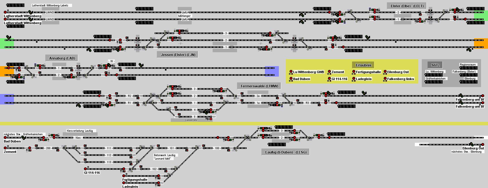 Hier seid ihr hauptsächlich für die stark befahrene Strecke Roßlau - Wegliniec im Abschnitt Lutherstadt Wittenberg-Labetz - Fermerswalde zuständig und damit für das Stück zwischen den beiden Knoten Lutherstadt Wittenberg und Falkenberg (Elster). Euch erwartet hauptsächlich Güterverkehr, der zum Teil im Blockabstand hintereinander her rollt. Außerdem habt ihr ein Stück der "Heidebahn" von Eilenburg Ost bis Bad Düben (jeweils exklusiv) auf dem Tisch. Hier fahren nur noch wenige Güterzüge, welche zur Kiesverladung oder zum Betonwerk unterwegs sind. Nur bei Veranstaltungen gesellt sich vereinzelt noch ein Personenzug dazu. Ansonsten ist die Strecke akut von der Stilllegung bedroht - und das trotz eines gar nicht allzu schlechten Zustands (die Strecke wurde erst um die Jahrtausendwende herum grundlegend saniert) und einer Bürgerbewegung, welche sich für die Reaktivierung des dauerhaften Personenverkehrs stark macht. Der Personenverkehr spielt nur eine untergeordnete Rolle. Neben der eben erwähnten RB 55 Lutherstadt Wittenberg - Eilenburg verkehrt nur noch die RB 51 Falkenberg (Elster) - Dessau mit Durchbindung nach Leipzig-Stötteritz, welche in der Hauptverkehrszeit durch den RE 14 bis Dessau verdichtet wird. Vereinzelte Fahrten enden bereits aus LuWi kommend in Annaburg. Anschließend fahren sie entweder leer bis Fermerswalde und wieder zurück oder setzen direkt in Annaburg um. Dann kann in Fermerswalde keine Ausfahrt nach Annaburg gestellt werden. Eine Bahnsteigwende in Annaburg lässt die Leit- und Sicherungstechnik aus Reichsbahnzeiten nicht zu. Gleiswechselbetrieb ist nur zwischen LuWi und Elster (Elbe) eingerichtet. Im weiteren Verlauf nach Falkenberg ist das Fahren auf dem Gegengleis nur per Befehl möglich. Einige Bahnsteige sind nur über einen ungesicherten Überweg über eines der Gleise erreichbar. Es obliegt dem jeweiligen Fdl (in diesem Fall also dir), sicherzustellen, dass kein Zug über den Überstieg fährt, während Fahrgäste diesen benutzen. Viel Spaß beim Spielen wünscht euch das Erbauerteam Sachsen. Sachsen (D)