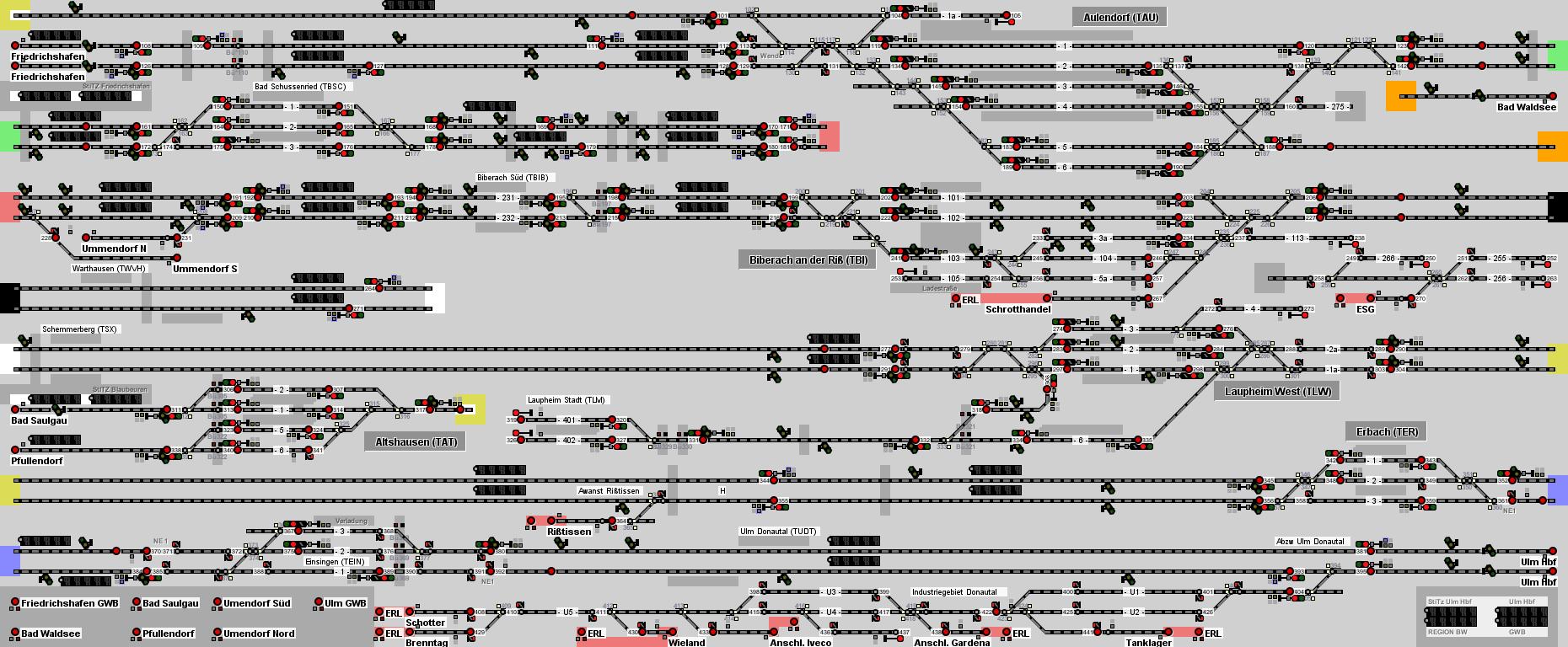 Ihr steuert hier einen Teil der Kursbuchstrecke 751 von Ulm nach Aulendorf. In Laupheim West zweigt die Strecke nach Laupheim Stadt ab, die auch noch bedient wird. Deswegen bei den RBs auf den Fahrplan schauen. Dies betrifft auch die RBs, die in Biberach Süd wenden, dadurch kann es dazu kommen, dass zwischen Biberach und Bad Schussenried im GWB gefahren werden muss. Zwischen Ulm Donautal und Erbach ist kein GWB möglich. Es werden sowohl die Awanst (Ausweichanschlussstelle) Langenschemmern, wie auch Rißtissen bedient. Zur Bedienung wendet der Zug an der mit einem "H" gekennzeichnetem Punkt und fährt dann als Rangierfahrt in die Awanst. In Biberach wird in den Abendstunden auch noch einmal mit 2 Rangierloks gleichzeitig rangiert, da der Bahnhof nich viele Möglichkeiten hat, müsst ihr hier die Hinweistexte im Fahrplan beachten. Bei Verspätungen solltet ihr immer gut auf anfallende Überholungen achten, die IREs und ICs sind hier die schnellsten Züge im Stellwerk, die Güterzüge die langsamsten. Viel Spaß wünscht das Erbauerteam BaWü |