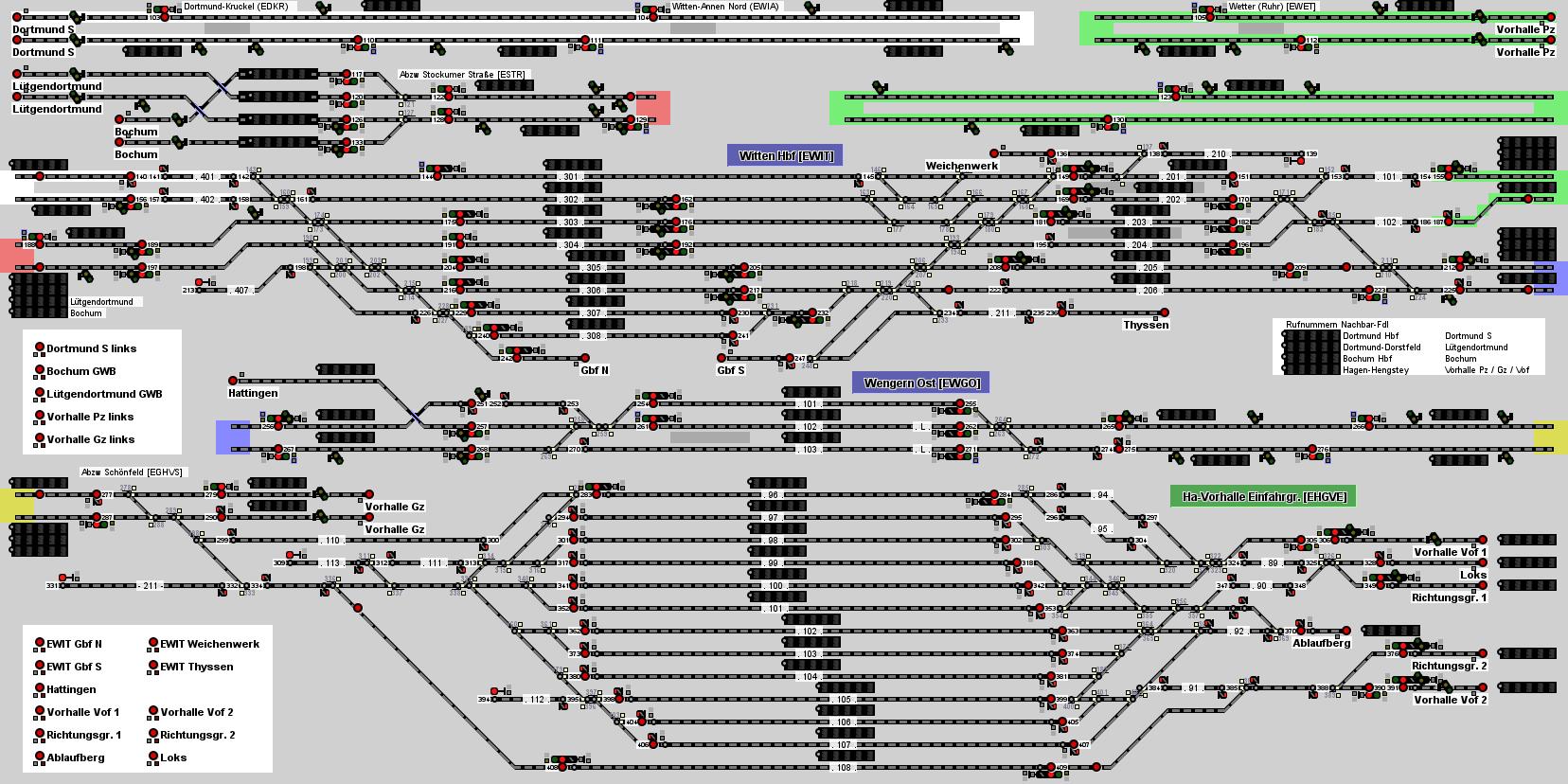 Headcodes and general information English version below Herzlich willkommen in Wembley. Ihr seid hier für einen Komplex aus zwei Strecken, zwei Depots, dem Londoner Paket- und Postzentrum sowie Güterbahnhof verantwortlich. Aber der Reihe nach: 1. Die DC Line Die DC Line führt von Euston nach Watford und hat als einzige Strecke in eurem Stellwerk keine Oberleitung sondern eine Stromschiene. Die Strecke wird von der Overground durch euer Stellwerk komplett durchbefahren. Des weiteren fährt die Bakerloo Line auf diesem Abschnitt auf der Infrastruktur von National Rail. Hier setzt ungefähr jeder zweite Zug aus bzw. ein. Diese Züge fahren direkt nach ihrem Halt ins Stonebridge Park Depot. Eure Nachbarn sind hier zum einen Watford und Queens Park. 2. Die West Coast Main Line Um das Stellwerk etwas besser händelbar zu machen ist bei euch nur die Slow Section zwischen Wembley Central und Harlesden Jn. abgebildet. Mitten durch den Gleiskomplex gibt es eine Verbindungskurve in Richtung Süden (Willesden No. 7). Diese wird von zwei Personenzügen pro Stunde und Richtung befahren. Normalerweise fahren die Züge nach dem Halt in Wembley Central über die Relief Lines zur South Jn. Ihr könnte sie jedoch auch erst nach den Gleisen 829/931 einfädeln lassen. Alle anderen Personenzüge fahren die grüne Strecke gerade durch. Eure Nachbarn sind hier Watford und Willesden. Bei den Güterzügen hingegen ist es deutlich komplexer. a. Der Güterbahnhof Der Güterbahnhof besteht aus mehreren Teilen. Zum einem dem Nodal Yard (No. 1-4, die restlichen Gleise wurden aus Platzgründen nicht dargestellt)., zum anderen die Brent Sidings (781-791). Des weiteren gibt es noch die A und B Sidigngs. Die B Sidings sind in Wahrheit Stumpfgleise zum Stapeln von derzeit nicht benötigtem Wagenmaterial und zum Be/Entladen. Die A Sidings werden häufig als Wembley Euro Freight Centre betitelt. Hier wird aktiv geladen. In allen Gleisen finden, auf Grund der zentrale Lage Wembleys, regelmäßig Personalwechsel und Lokwechsel statt (die Güterzüge fahren alle mit Diesel, die wollen befüllt werden). Die Züge haben öfters mal Aufenthaltszeiten von mehreren Stunden. Fast alle Loks kommen und gehen in die M und L Sidings. b. Railnet Sidings An die Railnet Sidings grenzt das Princes Royal Distribution Centre an. Dies ist das zentrale Postzentrum in London. Her verkehren täglich zwischen 6 und 10 Postzügen an die Küste im Nordwesten und nach Schottland. Ebenso viele kommen an. Die Postzüge werden dabei von einer Rangierlok in die Gleise 11 und 12 zum Be/Entladen geschoben. Des weiteren werden die Railnet Sidings gelegentlich benutzt, wenn der restliche Gbf bereits ausgelastet. c. Das InterCity Depot Im Intercity Depot werden neben dem High- und Lowland Sleeper ein Großteil der auf der WCML verkehrenden Fernzüge gewartet, gereinigt und eingesetzt. Hier ist es tagsüber recht ruhig, morgens und abends jedoch sehr voll. Die weiß hinterlegten Gleise sind die zum Depot gehörende Waschanlage. d. Die C Sidings Diese werden hauptsächlich von London Overground gemietet und benutzt. Auch hier ist es morgens sehr voll, ansonsten recht entspannt. Daher werden die Sidings tagsüber auch von Güterzügen verwendet, bis zum Abend müssen diese jedoch wieder leer sein. Alle Bereiche können (und werden) über die Up bzw. down carriage Line umfahren. Die Züge verlassen/betreten das Stellwerk in Richtung Central London entweder über die WCML (Ausfahrt Willesden slow) oder über eine Verbindungskurve der North London Line (Stellwerk Queens Park - Ausfahrt Kensal Rise). Züge aus Richtung Süden befahren und verlassen das Stellwerk über die Verbindungskurve in Richtung Clapham (Willesden No. 7). Bitte beachten: Die Züge werden vom Yard und den Depots im Durchschnitt 10 Minuten vor dem ersten Durchfahrpunkt abfahrbereit gemeldet. Nutzt dieses Zeitfenster sinnvoll, um zu disponieren Einige Tipps: Die Lokwechsel gehen quer durch den ganzen Stellbereich. Lasst euch Zeit, die meisten Güterzüge haben Standzeiten von einer Stunde und mehr. Nutzt zum Lokwechsel in den Brent Sidings die Strecke Richtung Kensal Rise. Für Lokwechsel im Nodal Yard könnt ihr die Railnet Sidings nutzen, oder die Gleise 5 und 6 in Wembley Central. Markiert euch die Züge mit der Ausfahrt Willesden No. 7 farbig. Dies ist bei den Personenzügen sehr hilfreich, die das Stellwerk hier verlassen. So könnt ihr die anderen Personenzüge ohne nachzudenken direkt durchstellen. Die Güterzüge haben einen realen Fahrplan. Dieser ist mit hohen Reserven von Network Rail gestrickt worden. Dies ist auch hier der Fall. Geratet also nicht in Panik, wenn ein Zug mal vor einem roten Signal steht. Nach Absprache mit Willesden könnt ihr Züge nach Willesden Slow über die Ausfahrt Willesden No. 7 umleiten, ebenso umgekehrt. Bitte nicht ohne Absprache umleiten, in Willesden muss die Fast Line gekreuzt werden. Viel Spaß. -- Welcome to Wembley Yards. You are responsible for two main lines, to depots the Royal Princess distribution centre and a big freight yard. 1. The DC Line The DC Line runs close by the West Coast Main Line. It is not equipped with overhead electrification! It's used by the Overground and Underground. Some underground services terminate at Stonebridge Park. 2. The West Coast Main Line You are only responsible for the pair of slow tracks between Wembley Central and Harlesden Jn. Right after Wembley Central a pair of connecting tracks diverges running thorugh the freight yard towards Clapham Junction and the South West. a. Freigh Yard The freight Yard is splitted in different parts: the Nodal Yard (No. 1-4),Brent Sidings (781-791), A and B Sidings. The A Sidings are in active use by DB Schenker (it's reffered as Wembley Eur Ops Freight Yard). The B Sidings are used for stabling only. There are change of engines at all tracks, due to the cental position of Wembley throughout the UK rail network. The engine are stabled and maintain at M and L Sdgs. Trains may have