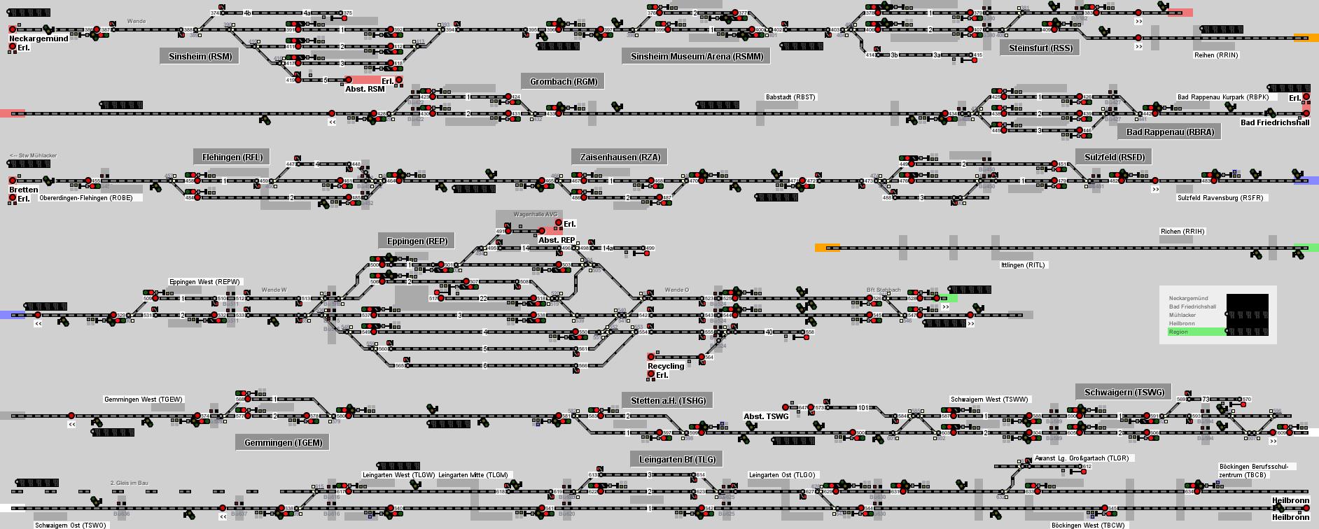 Ihr steuert hier einen Teil der Hauptstrecke Großhelau-Rhode (Gelb). Die Stadt Flohebach hat ca. 81.500 Einwohner und die Stadt Dollmenberg ca. 58.000 Einwohner. Dazu kommt noch die Hauptstrecke Kreuzenbeck-Leinde (Grün). Die beiden Hauptstrecken kreuzen sich in Flohebach Ost. Weiterhin müsst Ihr die eingleisige Nebenbahn Dollmenberg-Chatenkirchen (Orange) steuern. Obwohl es eine Nebenbahn ist, herrscht hier reger Zugverkehr, da die Strecke über den Chemiepark Chanau geführt wird. Am Bahnhof Chanau Nord ist ein Bahnübergang, der noch wärterbedient ist. Also bitte darauf achten, dass er nicht zu früh geschlossen wird. In Flohebach-Temmel muss der Anschluss zum Papierwerk bedient werden und in Dollmenberg ist ein Zementwerk. Hier verkehren alle Zuggattungen, wobei es im Fernverkehr nur die ICE/IC Linie 4 gibt. Das Team von Merxferri wünscht Euch viel Spaß im Stellwerk Flohebach-Dollmenberg. Merxferri (W)
