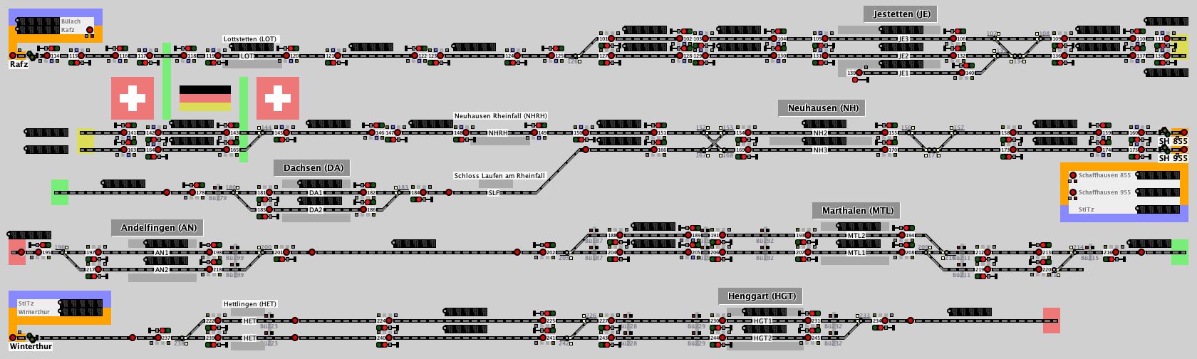 Euer Stellbereich umfasst die zweigleisige Neckartalbahn im Abschnitt zwischen Heidelberg und Eberbach (jeweils ausschließlich). In Neckargemünd zweigt die Elsenztalbahn ab, die ihr bis kurz vor Sinsheim steuert. Sie ist bis Meckesheim ebenfalls zwei- und danach eingleisig. In Meckesheim zweigt die eingleisige Schwarzbachtalbahn nach Aglasterhausen ab, die komplett in eurem Stellwerk abgebildet ist. Schließlich zweigt in Neckarbischofsheim die Krebsbachtalbahn ab, wobei sich hier Neckarbischofsheim Nord in eurem Stellwerk befindet. Betrieb Euer Stellwerkbereich wurde in den vergangenen Jahren deutlich ausgebaut und elektrifiziert. Die Strecken nach Eberbach (S1 und S2), Sinsheim (S51) und Aglasterhausen (S51) sind Teil der S-Bahn Rhein-Neckar. Die S1 und die S2 bilden dabei gemeinsam einen Halbstundentakt, gleiches gilt für die S5 und die S51 im Abschnitt bis Meckesheim. Ab Meckesheim verkehren die Züge je nach Tageszeit im 30- oder im 60-Minuten-Takt. Dabei werden die Züge in Meckesheim geflügelt oder gekuppelt, so dass ein abwechslungsreiches Betriebsgeschehen existiert. Im Personenverkehr existiert darüber hinaus eine stündliche RE-Verbindung von Mannheim nach Heilbronn, die abwechselnd über Eppingen und Sinsheim verkehrt. Den Gegensatz zu diesem modernen und attraktiven Verkehrsangebot bildet die Krebsbachtalbahn, die mit der S-Bahn ihren regelmäßigen Personenverkehr verloren hat und nur noch mit historischen Triebwagen im Freizeitverkehr bedient wird. Güterverkehr findet in eurem Stellwerk primär auf der Neckartalbahn statt, die einen Teil des Güterverkehrs in Richtung Stuttgart aufnimmt. Auf der Elsenztalbahn sind hier im Sim nur ein paar einzelne Güterzüge zu finden, ferner wird die Werkstatt in Neckarbischofsheim gelegentlich bedient. Besonderheiten
