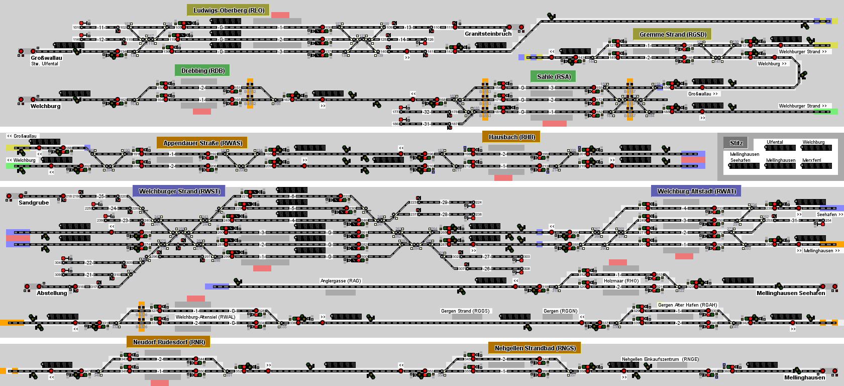 Auf der zweigleisigen Hauptbahn findet sich ein bunter Mischverkehr. Fernverkehr, Nahverkehr und diverse Güterzüge teilen sich die Gleise. Die Strecke Verden - Rotenburg dient hauptsächlich dem Güterverkehr und einer Regionalbahnlinie. Selten verirrt sich auch ein Fernverkehrszug auf die Strecke. Die Höchstgeschwindigkeit beträgt 160 km/h, sowie 120 km/h zwischen Verden und Rotenburg. In Verden gibt es zudem einen Anschluss zur Verden-Walsroder-Eisenbahn und weiter auf die Nebenstrecke nach Stemmen. Verden ist außerdem Endbahnhof für zweier Regionalbahnlinien. *Brm-Mahndorf* Es empfiehlt sich, bei Besetzung des Stellwerks Bremen Hbf, die automatische Fahrstraße an Signal 158 in Brm-Mahndorf auszuschalten, da sonst die Bahnübergänge schon ansteuern, wenn der'die Mitspieler'in eine Fahrstraße in den Verdener Stellbereich zieht. *Verden* Die Bahnsteiggleise in Verden, sowie Gleis 6, sind sehr kurz. Hier passen nicht alle Züge hinein. Legt darauf also ein besonderes Augenmerk. Für Fahrten von und nach Walle wird für gewöhnlich über Gleis 11 und 12 gefahren. In der Simulation fahren die Züge über diese Verbindung auch schneller, als über alle anderen Gleise in Verden. Bei Verspätungen kann es schonmal sehr eng werden, insbesondere auf der eingleisigen Strecke. Hier ist gutes Disponieren gefragt. Viel Erfolg. |