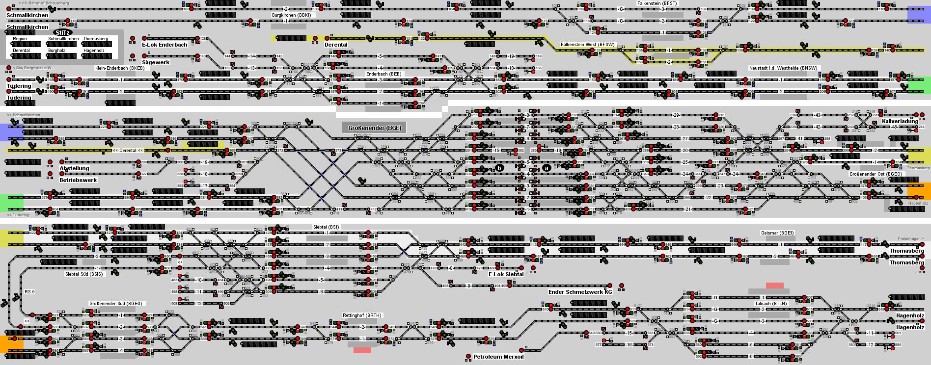 Aus Langenfelde müssen ab und an Züge umsetzen, etwa um zur Unterflur-Radsatzdrehbank zu kommen. Dafür ziehen die Züge auf dem orangenen Gleis 611 bis zum Einfahrsignal Altona vor und stehen teils bis nach Gleis 24 zurück. Züge aus ALA 97 müssen dann warten, andere Züge könnt ihr über das blaue Pz-Gleis fahren. Direkte Übergabe der Züge erfolgt zum Hamburger Hbf und nach Hamburg-Eidelstedt sowie zur S-Bahn. Nach Hamburg Hbf ist GWB möglich, nach Eidelstedt kann mit Ersatzsignal (Zs 8) links gefahren werden. Das Team Hamburg - Schleswig-Holstein wünscht viel Spaß :) |