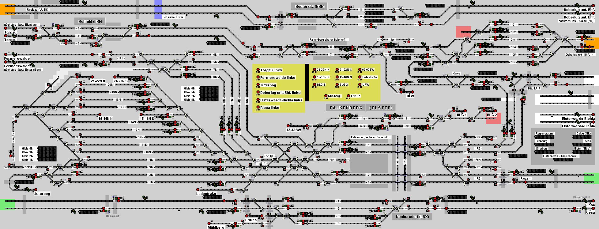 Hier steuert ihr den Turmbahnhof von Falkenberg (Elster), bestehend aus dem unteren Personenbahnhof (Gleise 1 - 4), dem oberen Personenbahnhof (Gleise 6 + 7) und dem unteren Güterbahnhof (Gleise 1N - 22N). Der obere Güterbahnhof versteckt sich hinter den Ausfahrten BLG 1 und 2, er gehört mittlerweile zur BLG Logistics Group. Alle vier Bahnhofsteile sind durch mehrere Kurven miteinander verbunden. Außerdem seid ihr für kurze Stücke aller zulaufenden und abgehenden Strecken verantwortlich: Jüterbog - Röderau von Falkenberg bis zur Blockstelle Jacobsthal, Roßlau - Wegliniec jeweils bis kurz hinter die Einfahrsignale und Halle (Saale) - Cottbus von Rehfeld bis Beutersitz. In Neuburxdorf an der Strecke nach Röderau zweigt außerdem noch eine kurze Anschlussbahn nach Mühlberg ab. Falkenberg ist zwar für den Personenverkehr ein wichtiger Umsteigeknoten, spielt im Güterverkehr aber eine deutlich größere Rolle. Auf der Strecke Roßlau - Wegliniec habt ihr es mit einem regen Transit zwischen Polen und den Nordseehäfen in Deutschland zu tun, aus Riesa kommend gesellen sich zusätzlich einige Container- und Autotransportzüge aus Tschechien und Glauchau kommend dazu. Apropos Autotransporte: Die BLG betreibt auf ihrem Gelände eine Instandsetzungswerkstatt für die dafür nötigen Waggons, ebenso verteilt sie von dort aus Waggons neu auf verschiedene Züge. Entsprechend werdet ihr es mit einigen Rangierbewegungen zu tun haben. Vereinzelt stehen hier auch Güterzüge ihre Betriebshalte ab und haben einen Personal- oder sogar Lokwechsel. Alles in allem habt ihr also einiges zu tun. Im Personenverkehr sorgen folgende Linien für Beschäftigung: